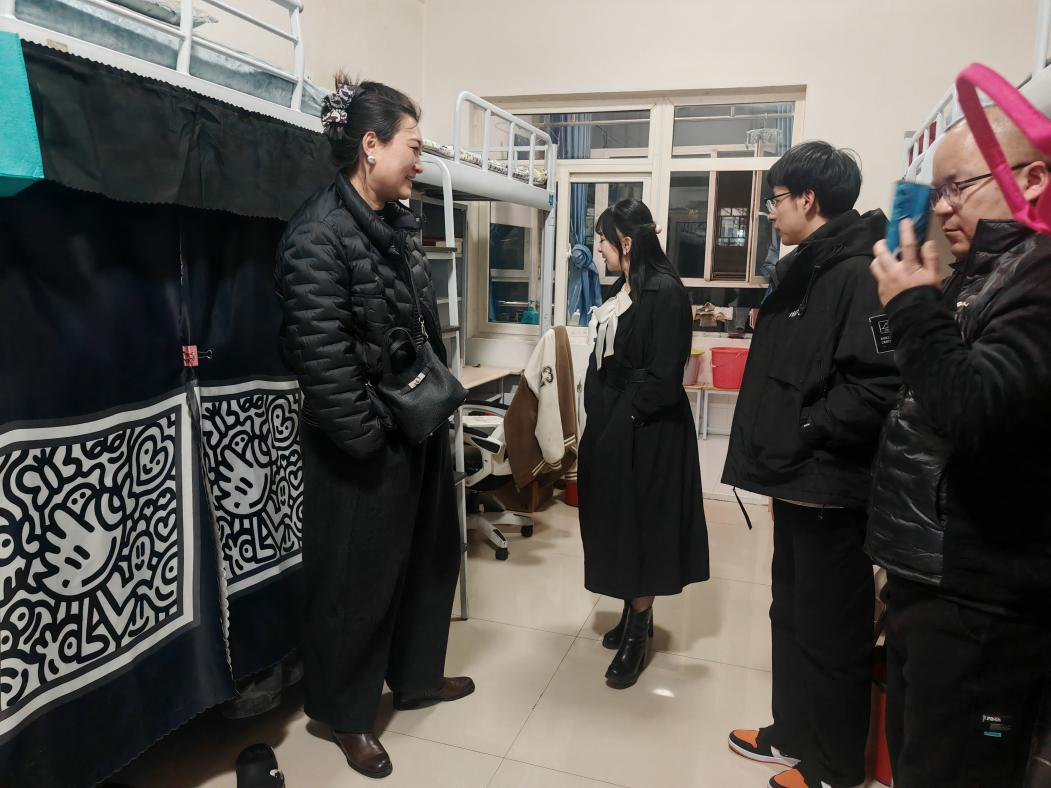 为切实加强学生宿舍安全管理,筑牢校园安全防线,营造整洁文明的住宿环境,在主题班会结束后,宋睿青带领全体辅导员、班主任深入学生宿舍,开展安全卫生大检查。检查过程中,宋书记一行逐间排查宿舍卫生状况、内务整理、用电规范及违禁物品存放情况,重点核查是否存在违规电器、私拉乱接电线、杂物堆积等安全隐患,仔细叮嘱学生严格遵守宿舍“十严禁”各项规定,坚决杜绝携带及燃放烟花爆竹、带入酒水等违禁行为。针对检查中发现的问题,提出整改要求,明确整改时限,确保隐患清零。